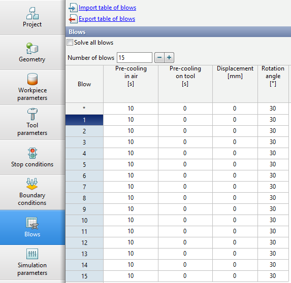18.In the tab Blows set the amount of blows (15), 15 lines will appear, in each you need to enter the cooling in air time (10 s) and the rotation angle of the workpieces between blows (30 °). Click Forward
