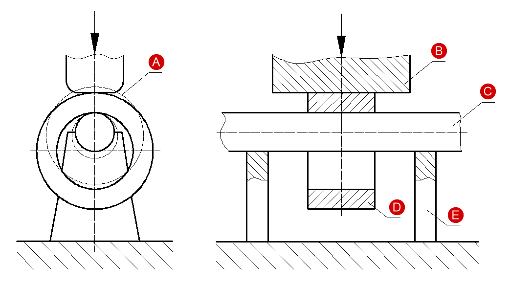 Saddling (also known as saddle forging or mandrel forging) is performed using an auxiliary tool instead of the lower die, consisting of two supports (E) and a cylinder mandrel (C). The heated and pre-punched workpiece (A) is deformed by the upper flat or spherical narrow die (B) on the mandrel (C), which in this case acts as the lower die. After each hammer or press blow, the workpiece is rotated by a certain angle. As a result of such deformation, the thickness of the rings (D) decreases, the width increases slightly, the cross cut plane also decreases and, consequently, its diameter increases. At the beginning of rolling, a mandrel with the diameter approximately equal to 0.9 of the diameter of the hole in the workpiece is used, then mandrels of a larger diameter are used. After obtaining the basic required dimensions, the resulting irregularities are smoothed out, giving the forging the required final dimensions. Saddling is used in the production of various rings, shells, gear rims and other similar parts. The figure below shows a saddling process.
