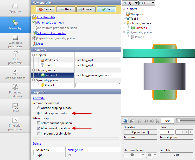 Click Load from file and specify the path to the file saddling_piercing_surface.shl. The Clipping surface will appear on screen. Select Clipping surface- Plain surface 1, and the properties of clipping surface will appear below. Specify Remove the material - Inside clipping surface, When to clip - After current operation. Click Forward.