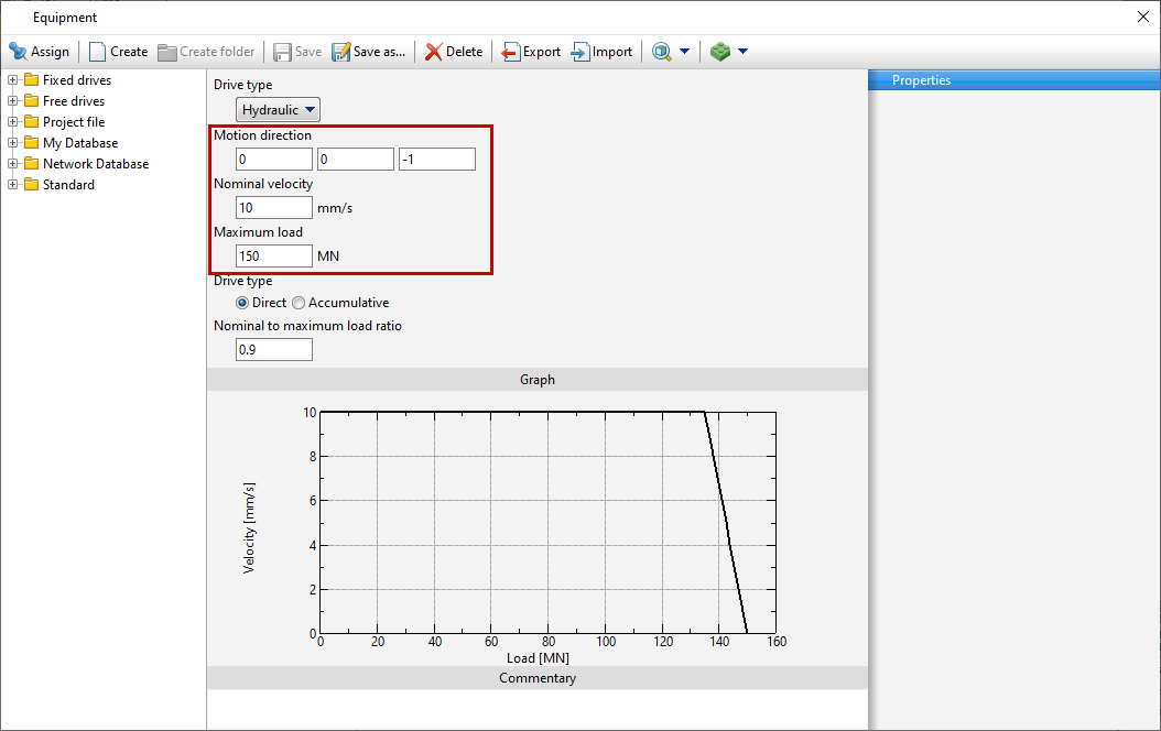 After that, click Save and give a name to the new equipment, for example, 150MN 10mm per s. In the database directory Project file the created equipment will appear, double-click on it, after that the selected drive will appear opposite to Drive.
