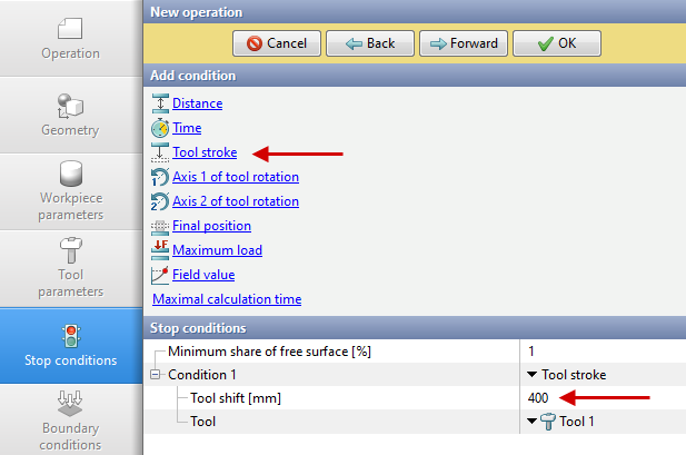 Opposite to Tool shift specify the tool shift value (400 mm) and select the tool for which the condition is set. Click Forward