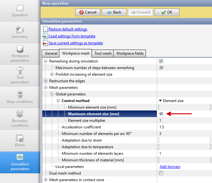 9.In the tab Simulation parametersmaximum element size should be set equal to 90 mm. This is the optimal element size for simulation of open die forging of large billets. Click OK