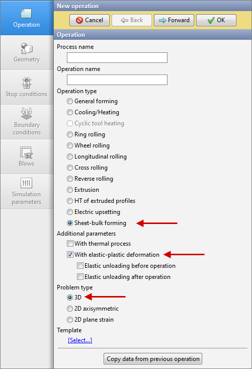 17.In the Operation tab, select Operation Type – Sheet-Bulk Forming, Additional Parameters – With Elastic-Plastic Deformation and Elastic unloading after operation, and Task Type – 3D. Click Forward .
