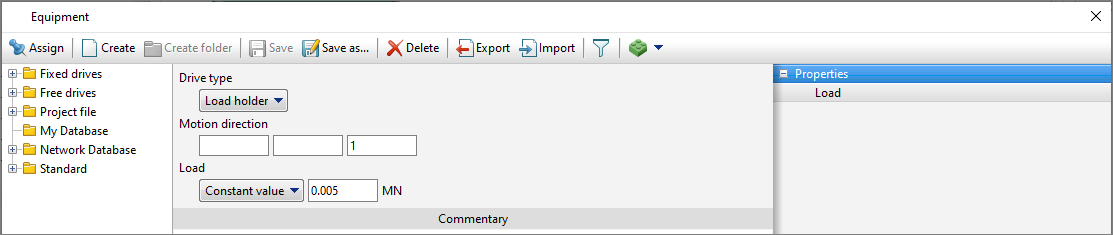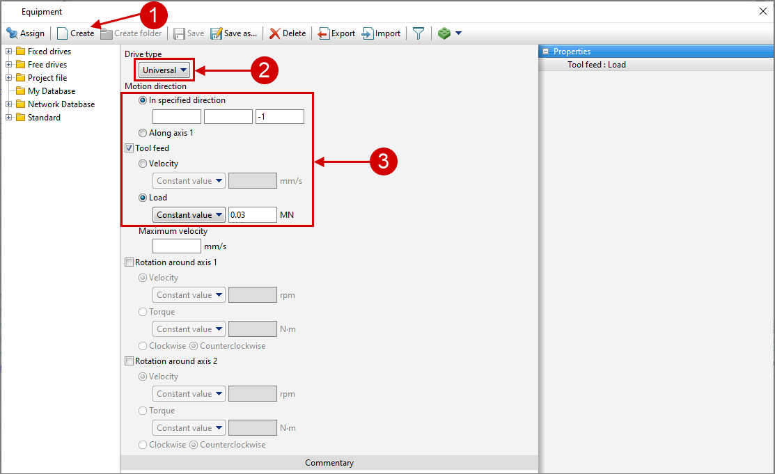 Similarly, for Tool 2, select the +OZ drive from the Fixed Drives folder as its drive. The equipment used as the drive for Tools 3 and 4 needs to be created. For this purpose, toolbars database windows Equipment click Create , select Drive type - Universal , Motion direction - In specified direction , Tool feed - Load , and enter the following parameter values: In specified direction - (0, 0, -1); Load - Constant value , 0.03 MN.