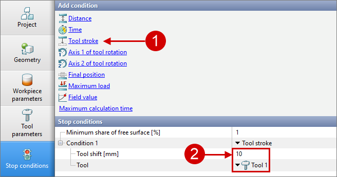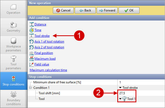 11.In the Stop Conditions tab, it is necessary to set the displacement of the deforming tool up to which the first operation is performed. Click Tool stroke . After that, in the Stop Conditions section, in the empty cell next to the Tool shift [mm] parameter enter the value 27.5, and from the dropdown list of available values for the Tool parameter, select Tool 1. Click Forward.