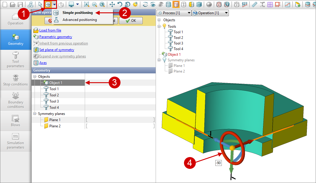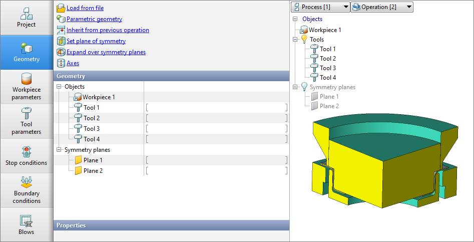 In cases where the process has mirror symmetry, it is recommended to simulate only the symmetric sector using symmetry planes rather than the full model to reduce computation time. Thus, the simulation of the example considered in this section was performed for a symmetric quarter of the model.