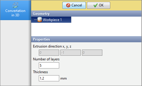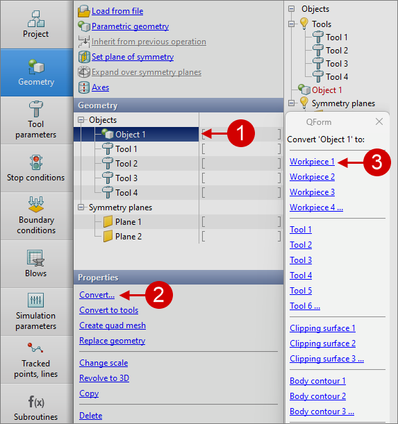 5.Select Object 1 , in the section Properties click on Convert... and in the list that appeared Convert 'Object 1' to: select Workpiece 1.