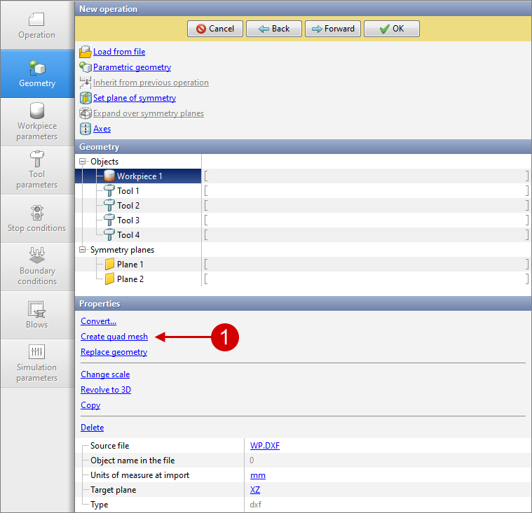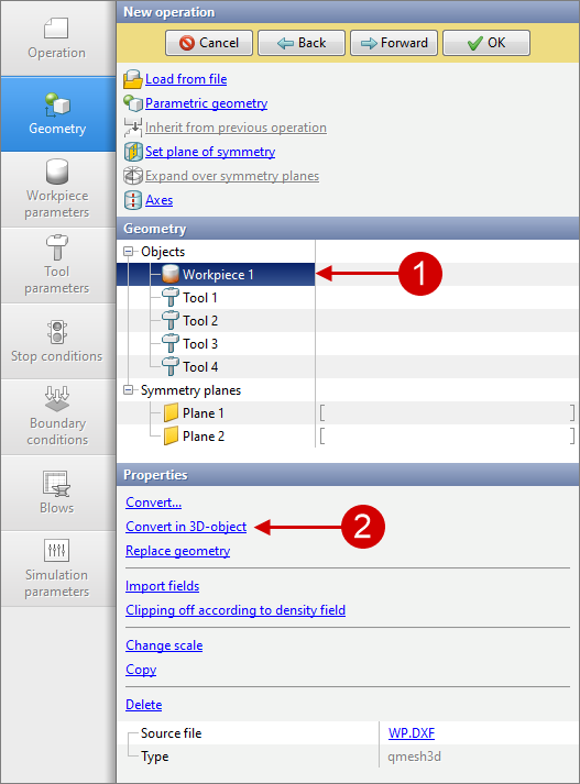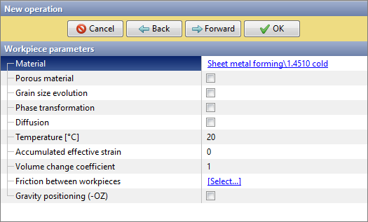 19.In the tab Workpiece parameters no changes need to be made. Just like the workpiece geometry, its parameters such as material, temperature, and deformation achieved during the operation are automatically transferred as initial conditions to the next operation when simulating a sequence of operations. Click Forward.