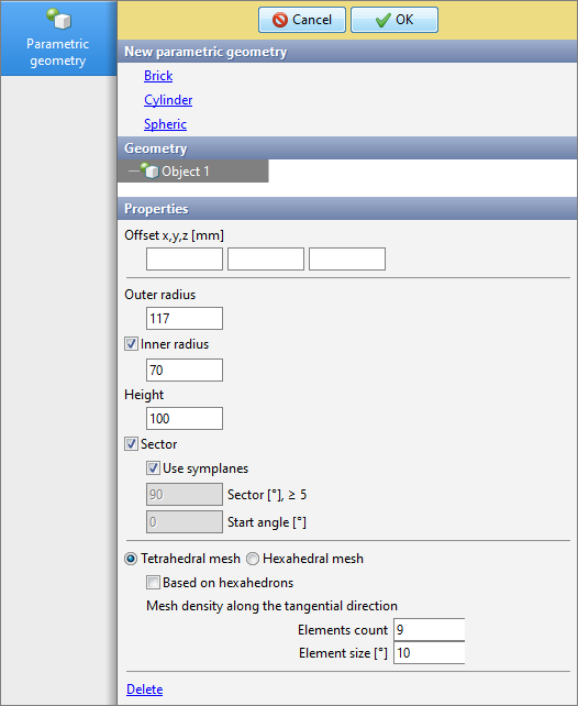 To create a geometric object corresponding to the clipping surface, click Parametric Geometry.In the section New parametric geometry select Cylinder , and then in the section Properties activate parameters Inner radius , Sector with Use symplanes and enter the following parameter values: Outer radius - 117 , Inner radius - 70 , Height - 100. Click OK .