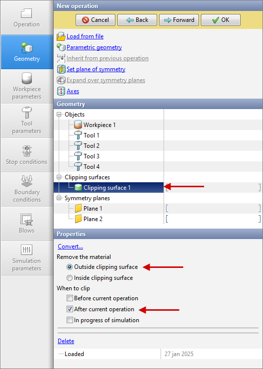 Make sure that in the section Geometry selected Object 1. In the section Properties click on Convert... and in the list that appeared Convert 'Object 1' to: select Clipping surface 1.In the section Geometry select Clipping surface 1 , after which in the section Properties please specify Remove the material - Outside clipping surface , When to clip - After current operation. Click Forward.