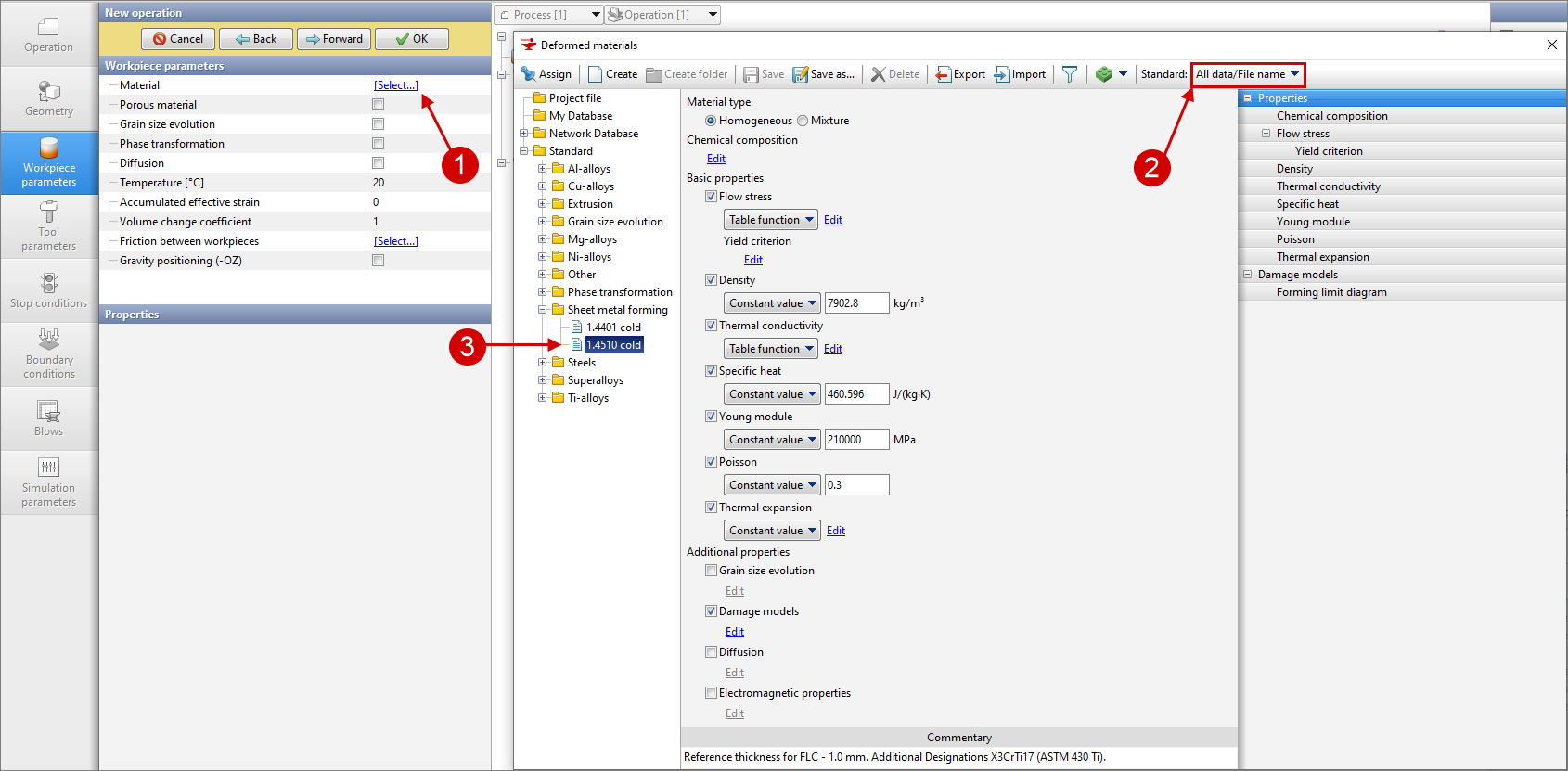 9.In the Workpiece Parameters tab, it is necessary to specify its material. To do this, click [Select...] next to Material. In the opened database window Deformed materials on toolbar in the drop-down list of parameter values Standard: select All data/File name , and then in the folder Standard\Sheet metal forming find material 1.4510 cold. Double-click to select it, after which the material will appear in theWorkpiece Parameters tab.