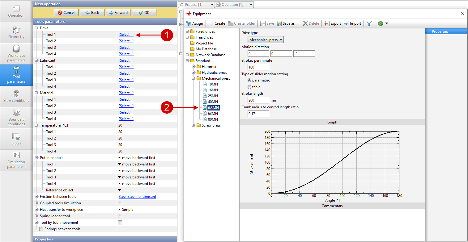 10.In the Tool Parameters tab, for each tool, it is necessary to select the drive type, lubrication, material, and disable its contact initialization with the workpiece. To set the drive for tool 1 in the section of the same name opposite it, click [Select...]. In the opened Equipment Database window, navigate to the Standard\Mechanical press folder, find the 6.3MN drive, and select it with a double-click, after which it will appear in the Tool Parameters tab.