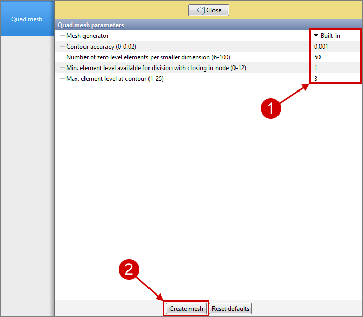 Enter the parameters for the generated mesh: Mesh Generator - Built-in, Contour accuracy - 0.001, Number of zero level elements per the smaller dimension - 50, Min. element level available for division with closing in node - 1, Max. element level at contour - 3. Click Create mesh , and then Close.
