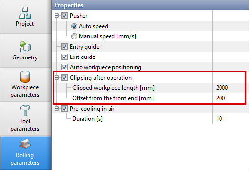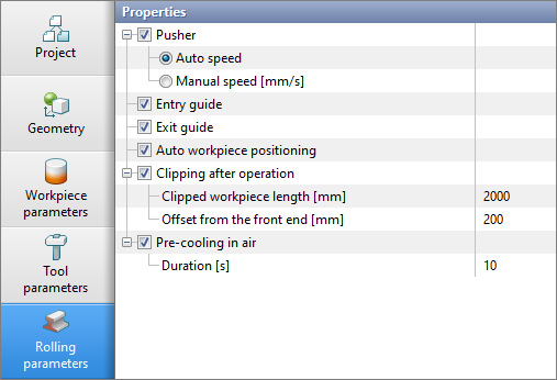•Rolling parameters are located in a special tab on the initial data panel; •The pusher and guides are enabled by default. They are not created as separate simulation objects, but act on the workpiece nodes as invisible boundary conditions. They don't need to be positioned and configured; •The workpiece is automatically brought into contact with the nearest roll in the rolling direction at the beginning of the simulation; •Simulation of air pre-cooling of the workpiece in the preprocessor is available;