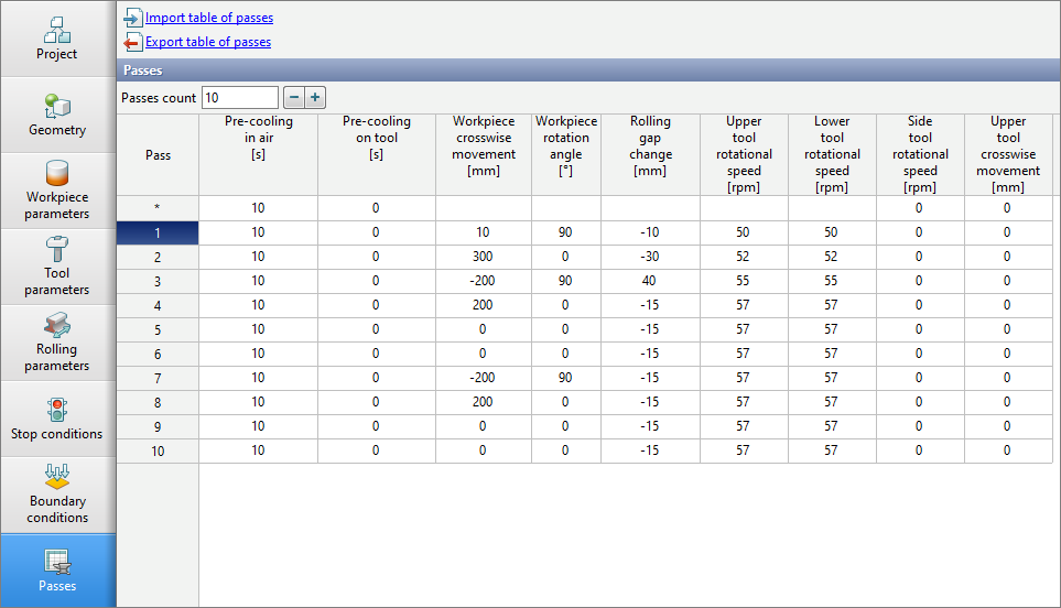 •Parameters of all passes are located in a special tab Passes. In the table Passes the initial data for each pass is entered and all passes are simulated in one operation, in which the workpiece is automatically transferred to the next pass. |