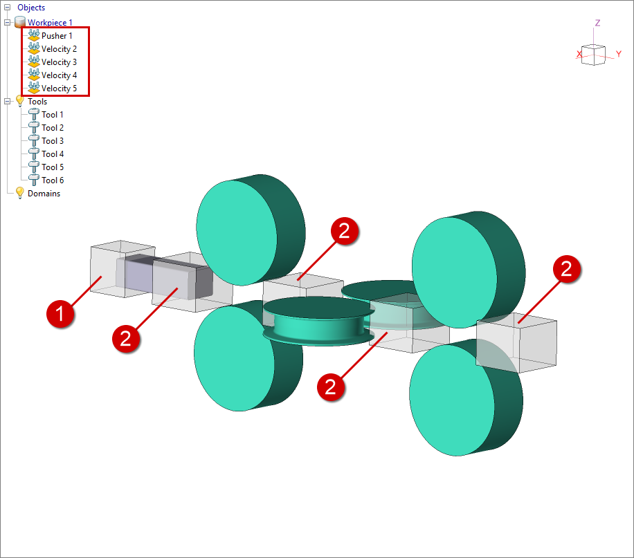 •The pusher and guides need to be created manually as boundary conditions, also their parameters and position should be set; •Positioning of the workpiece before starting the simulation is done manually; 1 - Boundary condition Pusher; 2 - Boundary condition Velocity. |