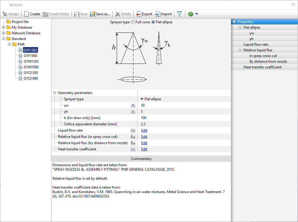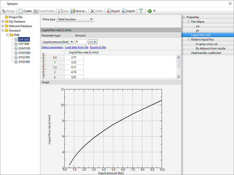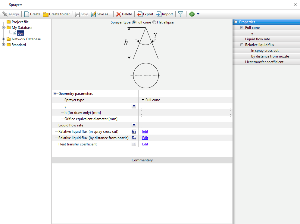 Standard sprayers database, supplied with the software, contains examples of sprayers. The sprayers database allows you to create and store sprayer models for quick and convenient configuration of liquid and air-liquid cooling systems.