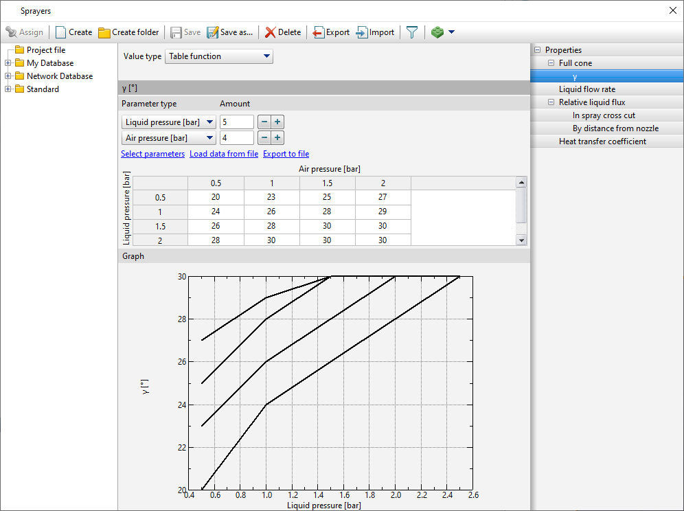 The angles value can be constant or set as a table function of pressure, which makes it possible to take into account the possible change in the spray angle depending on the liquid and air pressure.