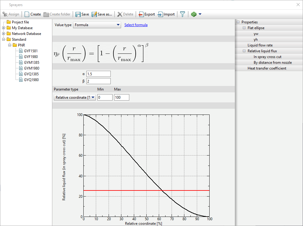 Relative liquid flux determines the pattern of spraying, namely the distribution of the flow of the liquid within the boundary condition. It is possible to adjust the relative fluid flow By cross section and By distance from nozzle. These parameters are a liquid flow rate multiplier, i.e. determine the relative velocity of the fluid at any point in domain of the boundary condition. These parameters can be specified by a table function or formula. The parameters of the formula for the relative fluid flow by cross section by default correspond to the general fit by sprayer.