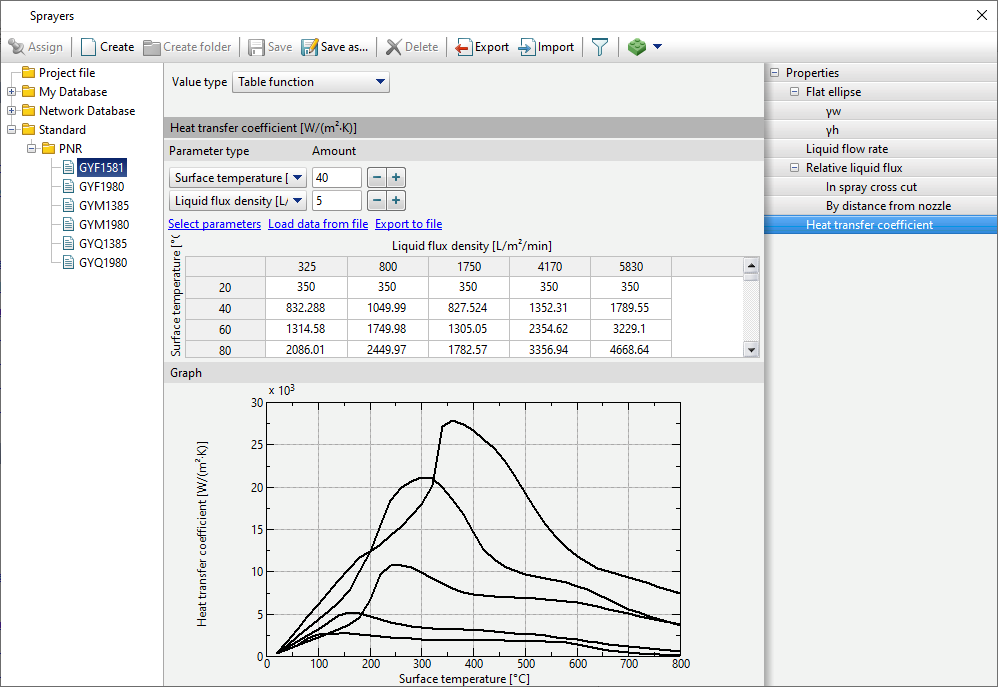 When the sprayer acts on the cooled surface, the liquid flow is recalculated into the surface density of the liquid flow. The Heat transfer coefficient can be constant or given by a table function. As arguments of the table function, it is possible to specify the Liquid flux density, Surface temperature and Liquid temperature.
