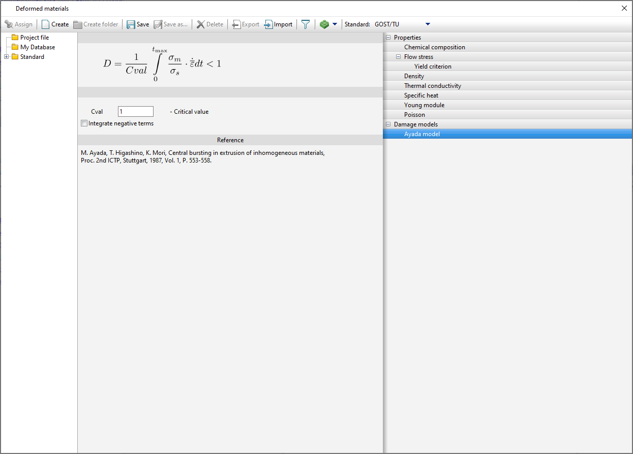 The Ayada damage model is one of the engineering models used in fracture mechanics to evaluate the ultimate state of a material under the accumulation of plastic deformations. It is widely used to describe the failure of metals under cyclic and static loads, particularly in aviation and machinery industries.
