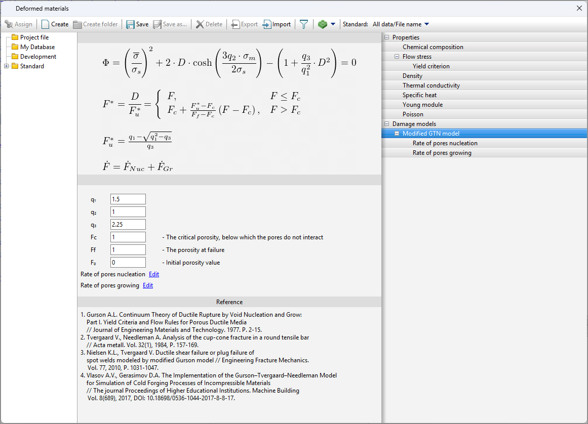 The modified Gurson-Tvergaard-Needleman (GTN) model is a physically-based material damage model that describes the process of micropore nucleation, growth, and coalescence in metals, ultimately leading to material failure. It is particularly important in problems related to the analysis of metal strength and plasticity under large deformations, specifically in stretching, deep drawing, cutting, forging, and other forming processes.