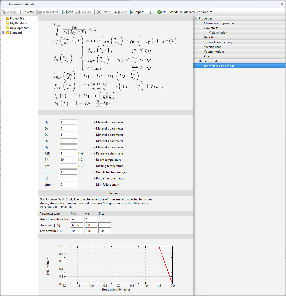 The Johnson-Cook damage/failure model is widely used in fracture mechanics and numerical simulations of metal deformation and failure processes under extreme conditions — high strain rates, temperatures, and pressures.