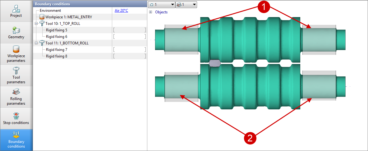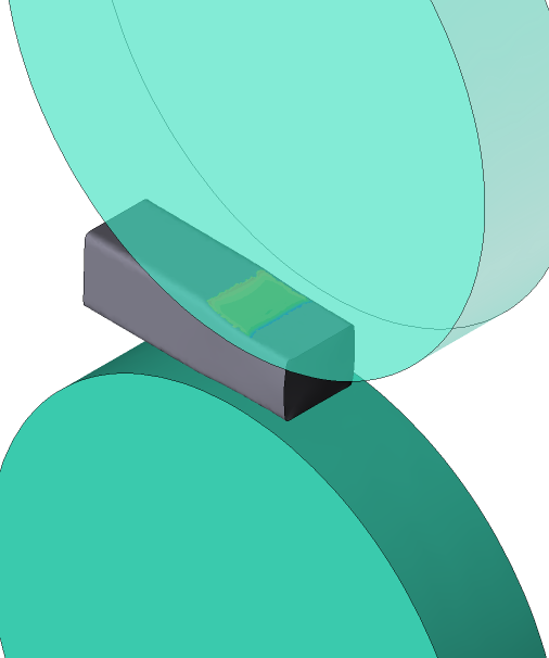Roll strength analysis is comparable to the approaches used for calculating die strength in hot forging. The main idea is to analyze the stress distribution in the tool. The effective stress is compared with the yield strength of the roll material. Exceeding the yield strength value indicates the start of plastic deformation and defect formation. Average tensile stresses combined with high effective stress in a local area indicate the probability of crack initiation or its formation after a certain number of cycles. Recommended procedure for roll stress analysis: Before performing the simulation, it is necessary to set the boundary conditions (see Boundary Conditions section). The roll fixation scheme is determined by the stand design. The most common option is adding fixings to the roll neck. After fixings, at the postprocessor stage, perform Simulate tools independently. In this setup, the force from the workpiece is applied to the contact surface area of the roll.