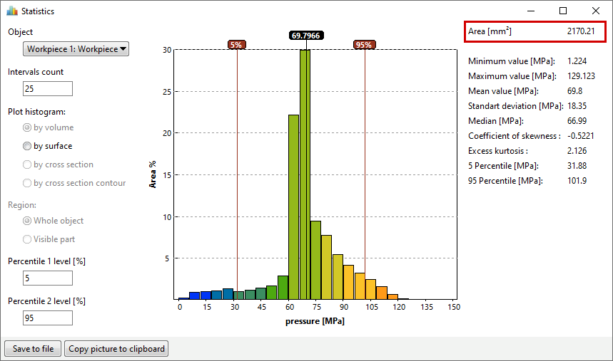 •To analyse temperature, use the Temperature field. Temperature values can be viewed both on the strip surface and in a section (see the Output fields section). •To analyse the contact area, run the Pressure subroutine With the pressure or friction field active, the contact area is shown on the Statistics tab.
