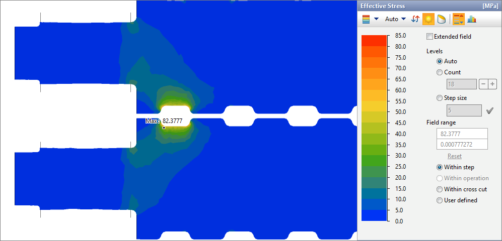 After the simulation is completed, the tool fields become available, and a marker appears on the result playback scale indicating the step at which the simulation was performed. Next, it is necessary to compare the maximum effective stress with the yield stress of the material and pay attention to areas with mean tensile stress. The maximum effective stress is localized at the fillet radius in the groove bottom area and amounts to 82 MPa, which is significantly lower than the yield stress of this material. |