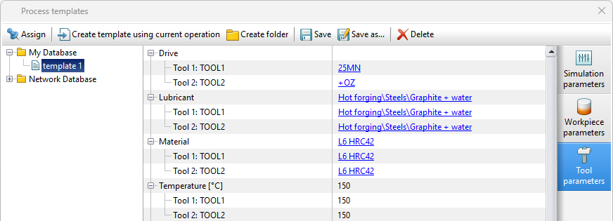 Process templates are used to automate setting the initial data for simulation. User can save some initial data from a typical process and then use this data in other simulations. For example, if a typical process is forging a steel C40 workpieces at 1250°C with a steel C40 tool with initial temperature of 200° and graphite-water lubricant, the initial data for that process can be loaded with one click from the corresponding template.