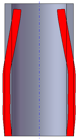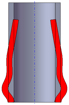 The analysis of different process factors influence on the accuracy of determining the friction factor is described in a study by T.Scharader et al, (2007). The research was carried out for the following tool dimensions: D=15.88 mm, d=9.53 mm, D1=15.72 mm, R=1.17 mm, h=1.57 mm, φ=10°, β =5°. The workpiece dimensions: diameter 31.75 mm, height 31.75 mm. Container diameter is equal to workpiece diameter. However, even this in-depth experimental research does not guarantee the accuracy of friction factor determination, because some real parameters of production processes are not accounted for; besides, friction factor can change during deformation at the expense of the lubrication pressing out and different velocity conditions at the contact surface. Therefore, it is necessary to carry out several variants of simulation by changing the friction factors and Levanov's coefficients within due limits. If the change of the deformed state (external shape of workpiece) and of the graph of deforming force behaviour along the tool path in these variants is minor, then these results are the most reliable. If not, it is necessary to perform extra research. Below an example is shown of friction factor and Levanov's coefficient impact on the workpiece shape obtained during simulation of the swaging operation without lubrication of tube workpiece 3, with thickness 3 mm, height 58 mm, outer diameter 30 mm of aluminium AA1135 (AISI/SAE) / AD1 (GOST/TC) for the same tool pass 1.