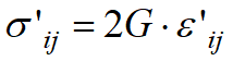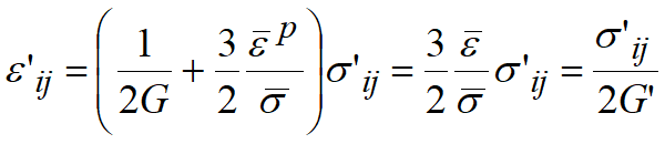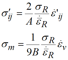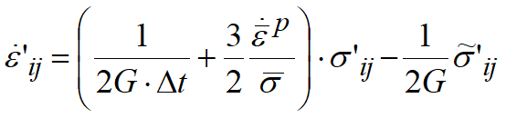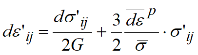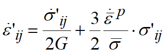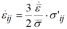In these equations the strain deviator increment depends both on stress deviator increment and stress deviator itself σ'. First term in the formula describes the elastic strain increment. Second term describes the plastic strain increment. As for strain rates Prandtl-Reuss equations have a form: