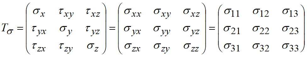 We will decompose the stress applied to every surface into three components: normal stress σ that is perpendicular to surface, and two shear stresses τ located in the plane of surface and directed along the coordinate axes (fig. a). The rule of stress subscripting: the first subscript indicates the direction of the normal to surface, and the second - the direction of axis to which the vector is projected. For normal stresses the direction of normal to surface and the direction of action coincide, therefore, for brevity, instead of, e.g. σxx is used a designation σx. An alternative method of stress designation and subscripting (fig b): all the components of stresses in the coordinate planes (both normal and shear) are denoted by ℘. If the subscripts coincide, e.g. σyy, then the stress is normal, if not, e.g. σyz, then the stress is tangential. In technical literature a numeric notation is often to shorten the record used (fig.c). That is done by associating the axes x, y, z with designations x1, x2, x3. In this case at set of stresses in thee coordinate planes can be denoted as σij, where i, j take the values 1,2,3. The set of stresses in three mutually perpendicular planes going through the stressed point of continuum medium forms the symmetric tensor of second-order called the stress tensor. Depending on the used subscripting the stress tensor takes the form: