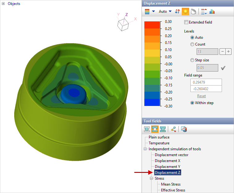 To show the displacement along oz select Displacement Z, as in the picture below. Need to pay the attention that the upper tool and the workpiece are hidden, the symmetry display of the tool is active using the button Symmetry
