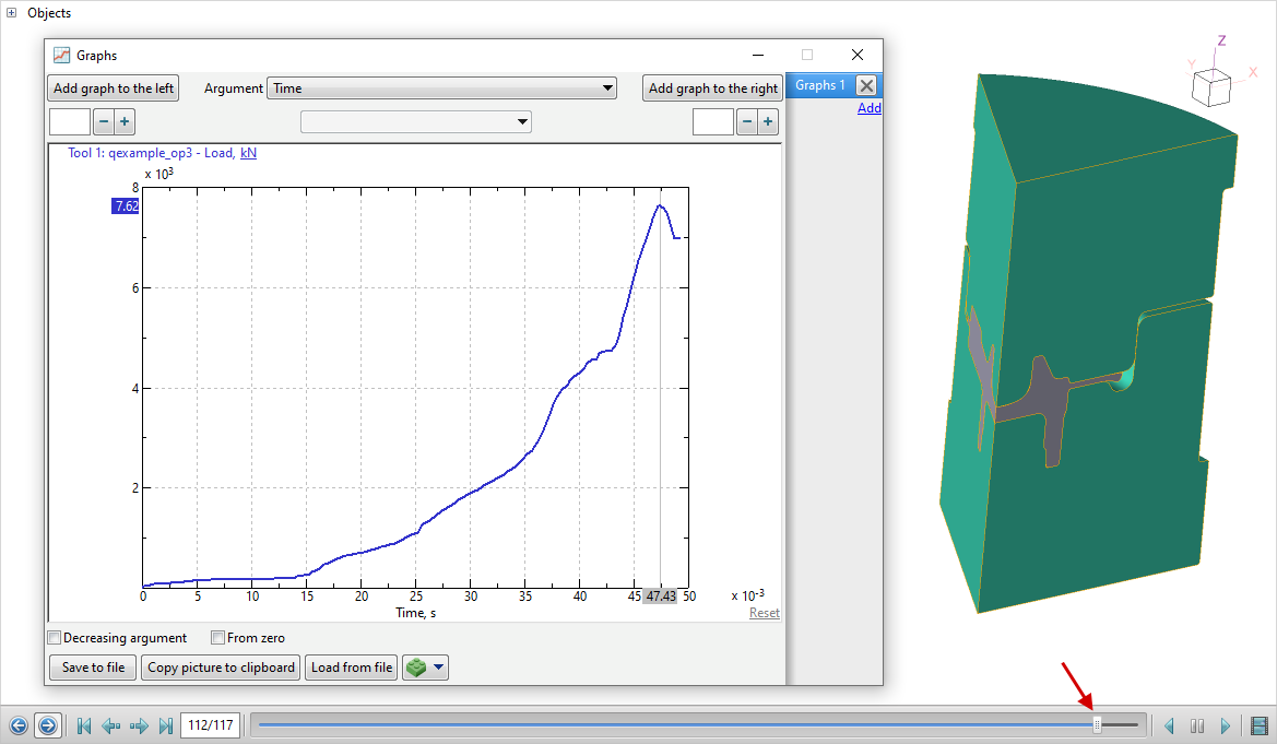 Select the simulation step that corresponds to the maximum load on the tool. To do this, click the button Graphs