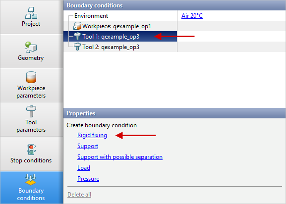 To implement tool simulation, it requires to set rigid fixing of tool in the tab Boundary conditions. Highlight Tool 1, and a list of boundary conditions will appear below. Click Rigid fixing: