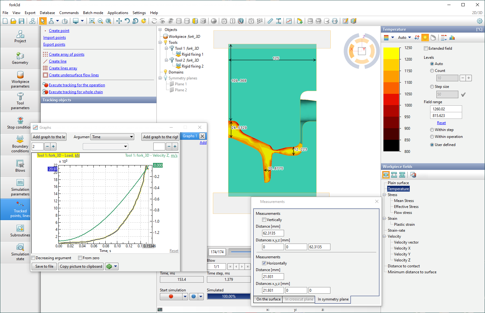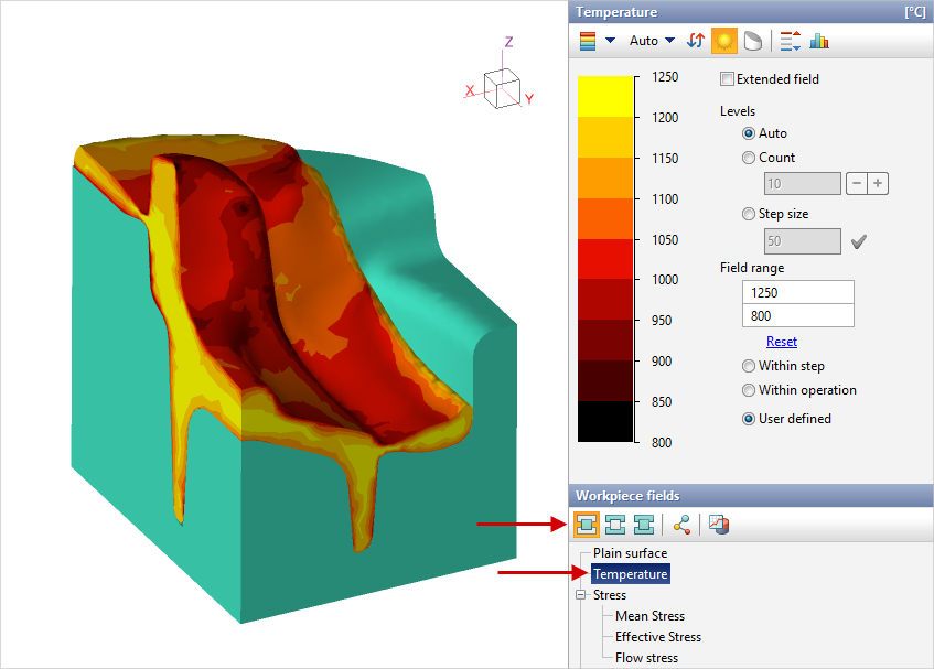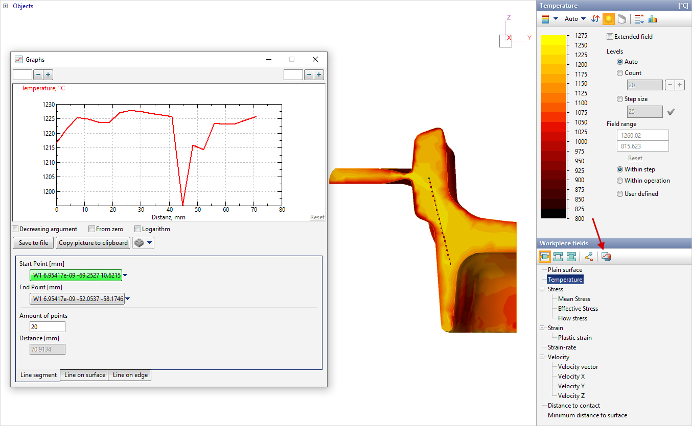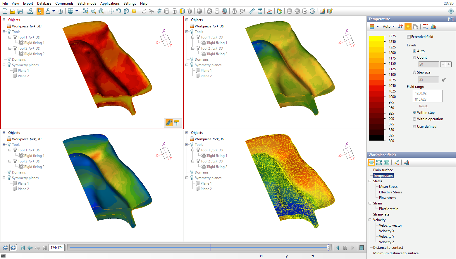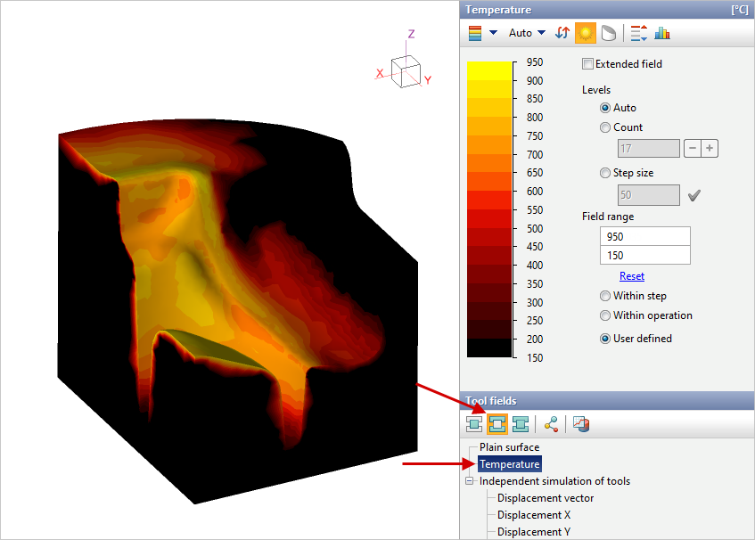 The tools to control the output of the fields are located on the right side of the main program window. The simulated fields are divided into four groups: workpiece fields, tool fields, common fields and fields at tracking points: