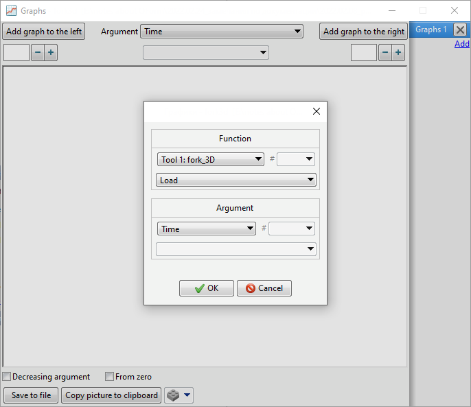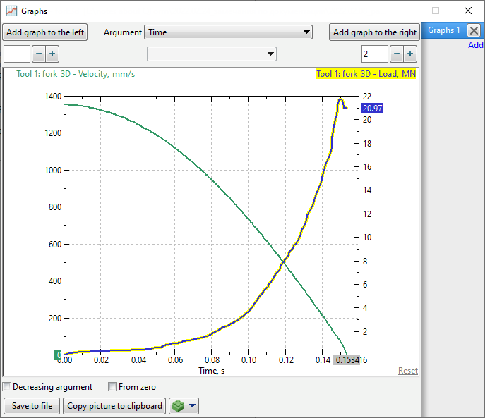 The window for displaying graphs is opened with the button Graphs It is possible to display graphs of energy-power and kinematic characteristics of tools, workpieces volume, some simulation parameters, as well as calculated values at tracking points: Export of data from graphs is carried out in files with extensions *.xlsx, *.xls, *.csv See also: |