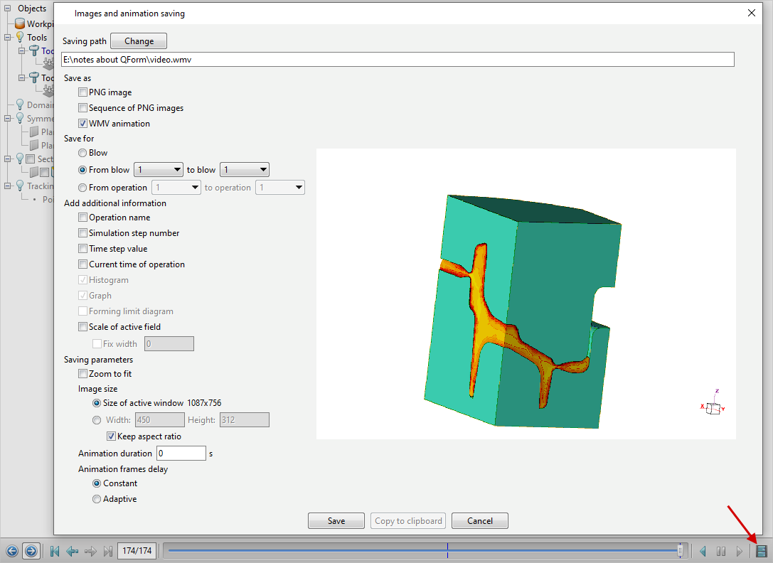 To saving images and animations with simulation results , click the button In the window that opens, you must specify the directory for saving graphic files and other settings for images or animation. Images are saved as files with the extension *.png, animation - to files with the extension *.wmv See also: |