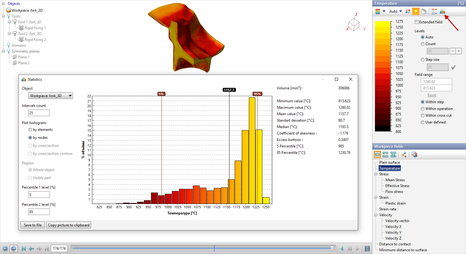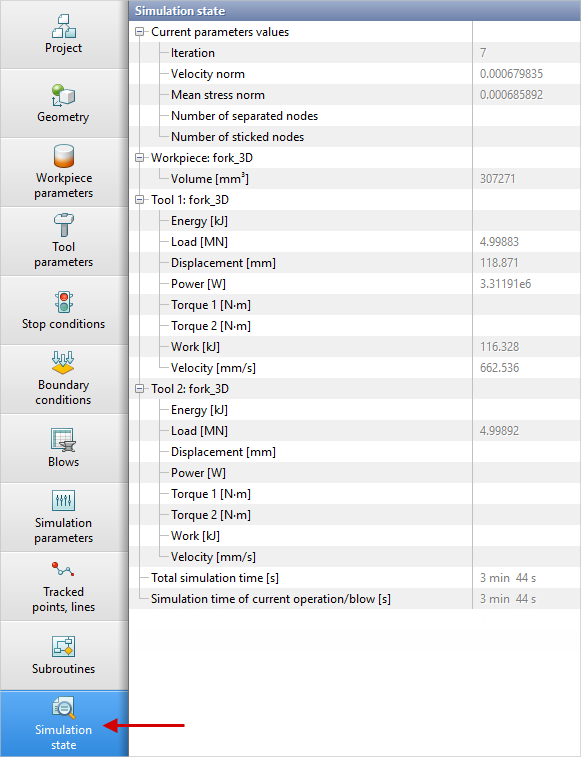 Tab Source data panels Simulation state is used to display the values of the simulation parameters, power and kinematic tools parameters, workpieces volume , as well as the simulation duration for the current simulation step: When you click on a workpiece or tool with the right mouse button in the list of commands , the command is available Field value at point With the commands Show graph of a function along a line You can view detailed statistical info about calculated fields: See also: |