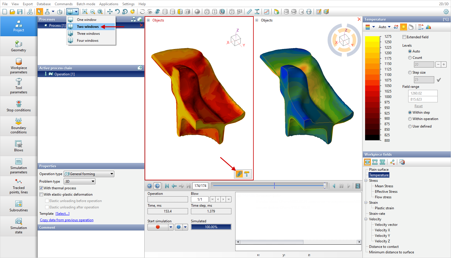 The multi-window mode for viewing simulation results allows you to divide the applications window into several windows (from one to four), in each of which the same simulated operation or different operation from one or different projects can be opened (*.qform-files). It is possible to synchronize the display options of objects and calculation fields in different windows, link the position and linear scale of objects in different windows: To make it easier to analyse the results, you can enlarge the viewing area of the simulation results by hiding the bottom (Ctrl + B) and left (Ctrl + L) panels. You can also hide panels and select the number of windows inMain Menu > View.