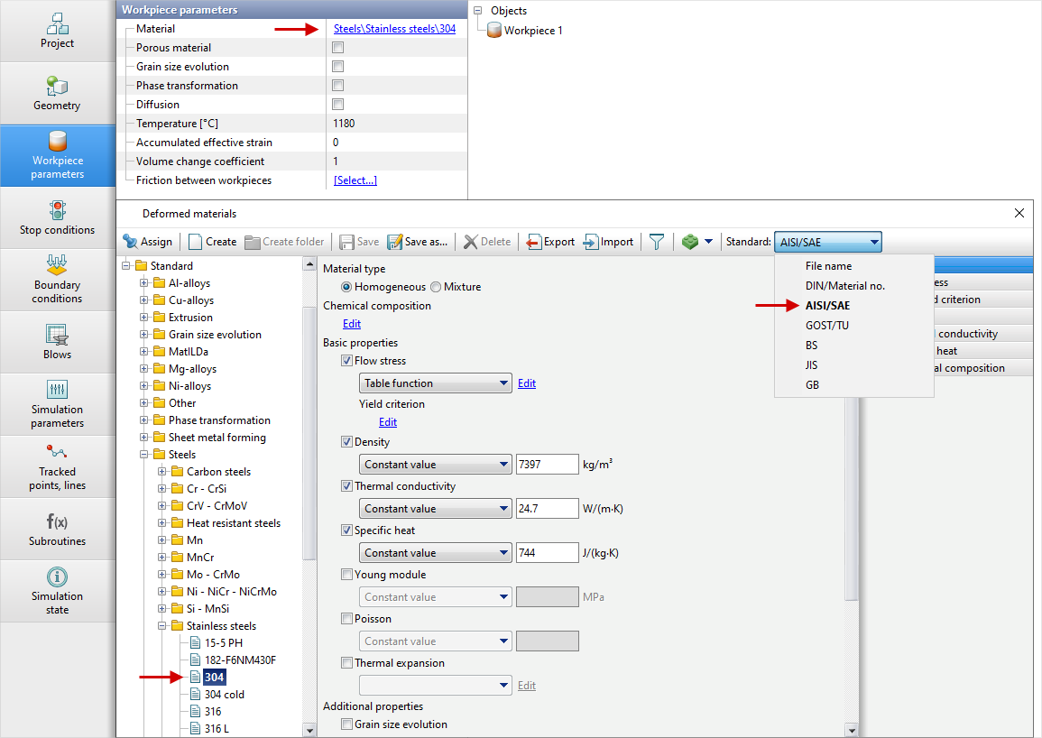 Material, temperature and additional parameters of the workpiece are assigned on the tab Workpiece parameters: